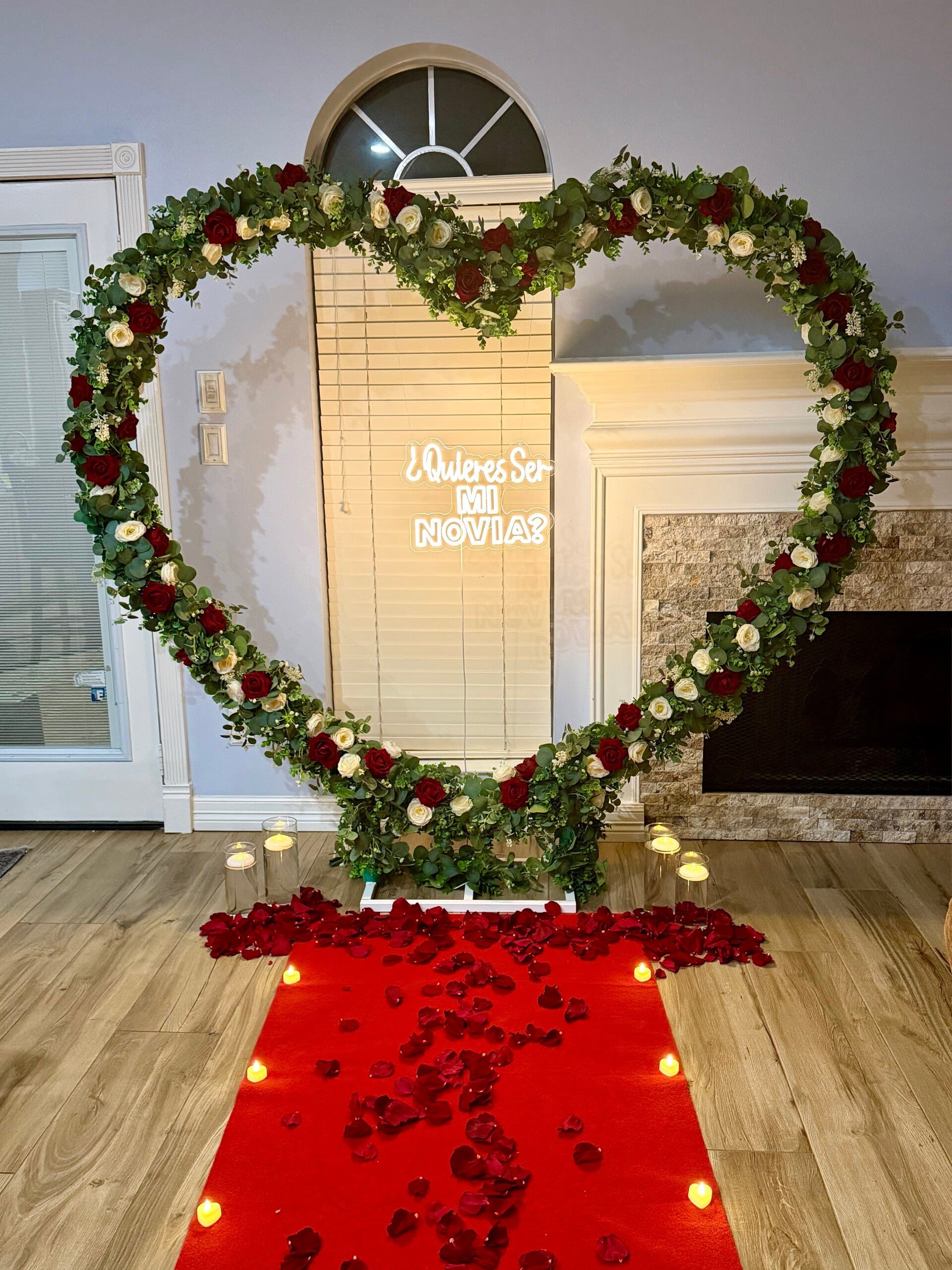 Create a stunning and romantic moment with our Heart Arch rental. This eye-catching setup features a beautifully styled heart arch, perfect for proposals. Designed to elevate your experience, we handle the full setup and breakdown—so you can simply arrive and enjoy your unforgettable moment.